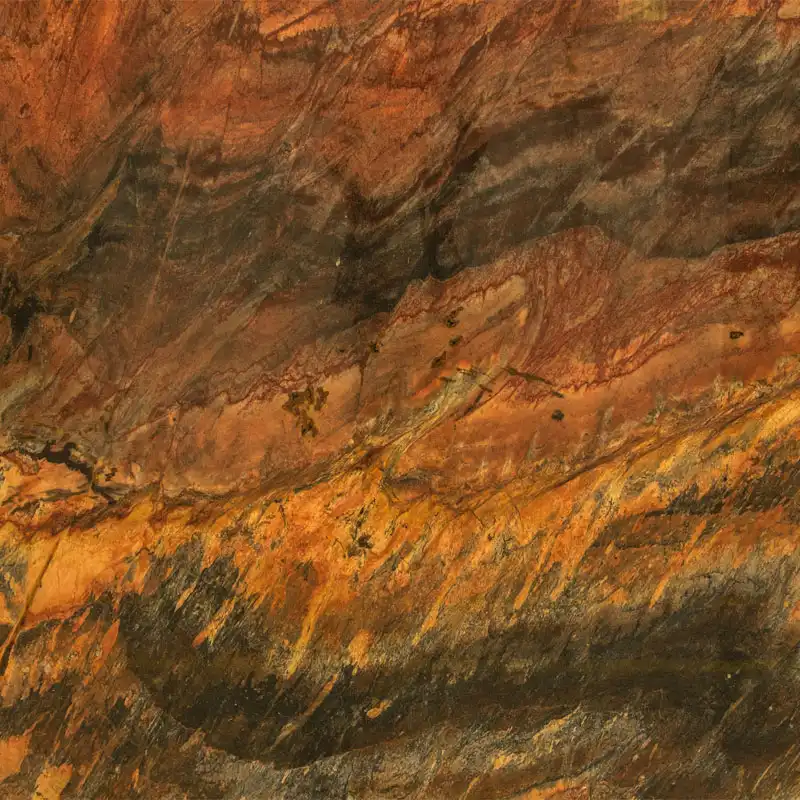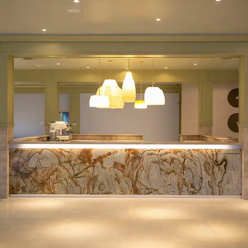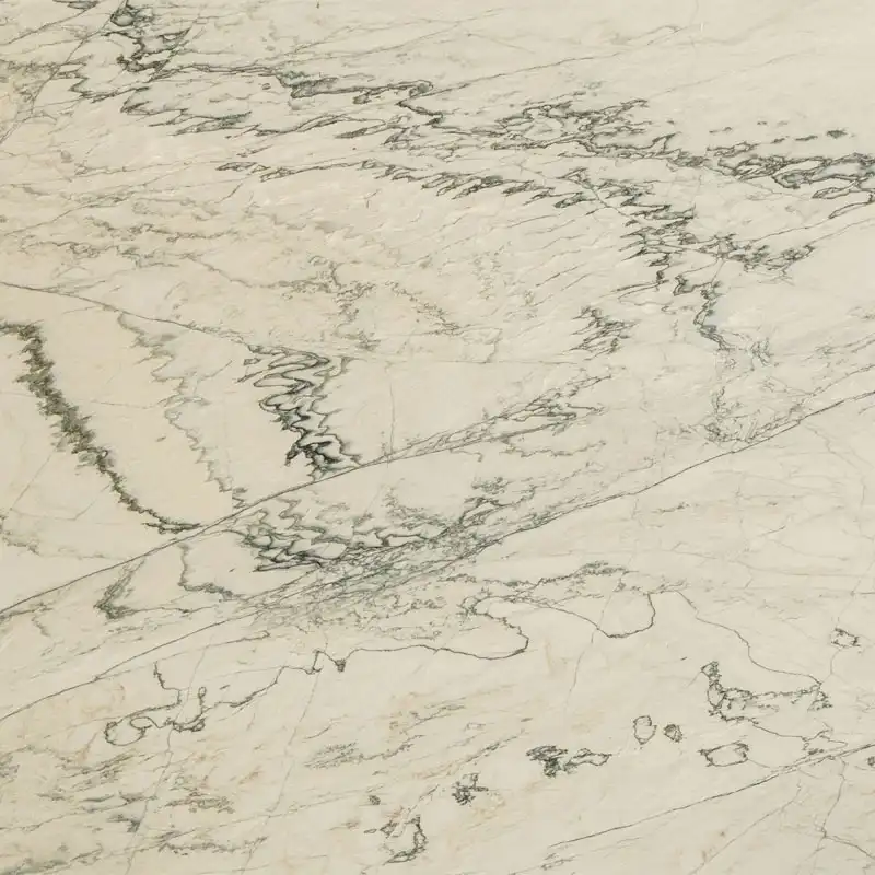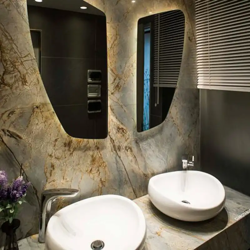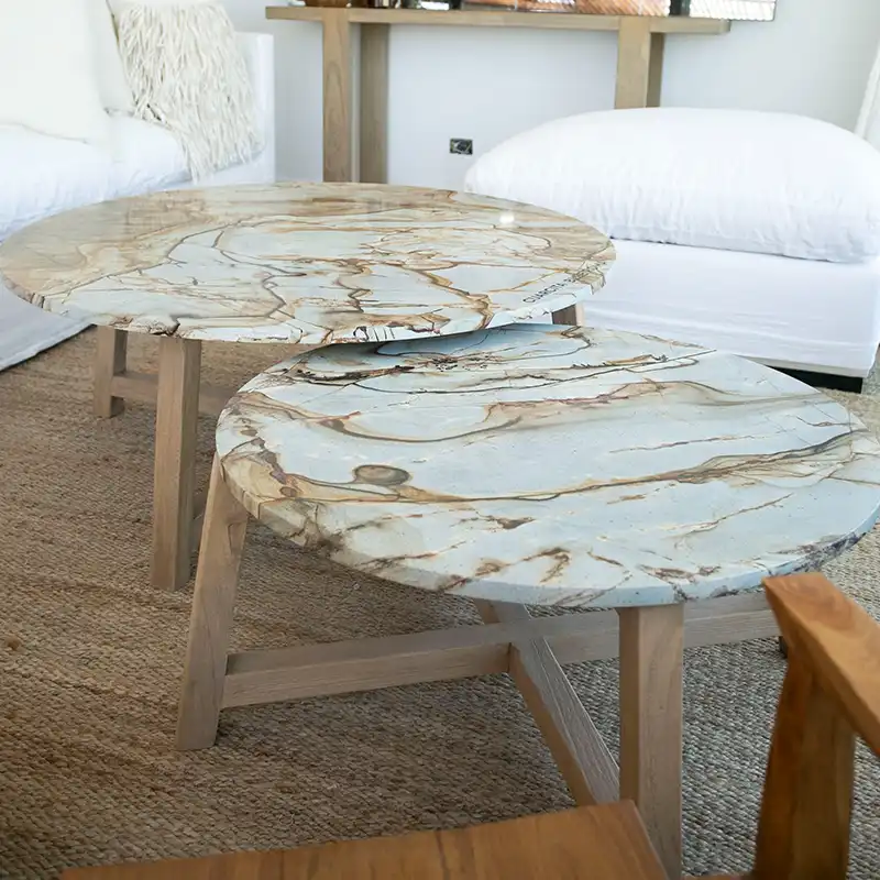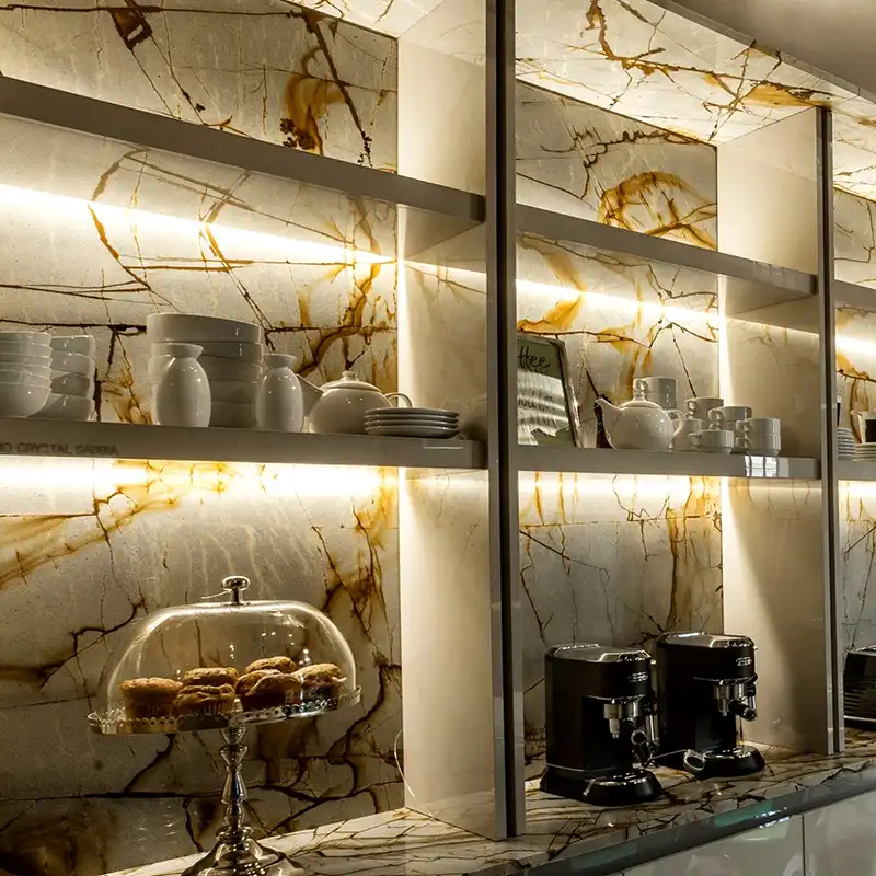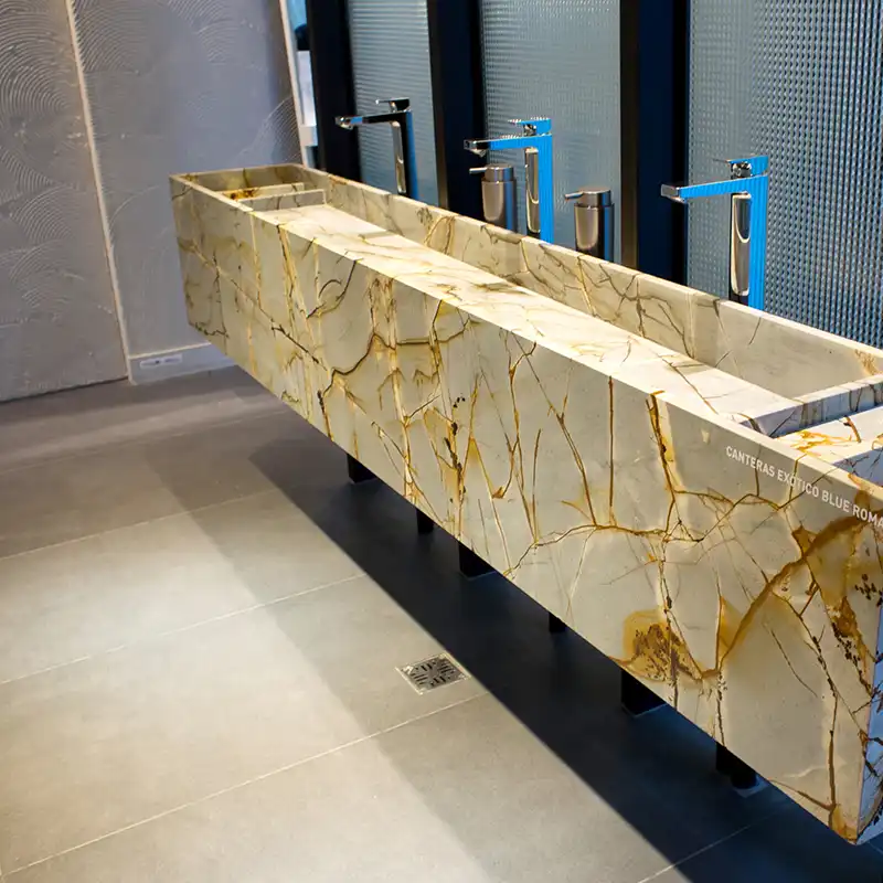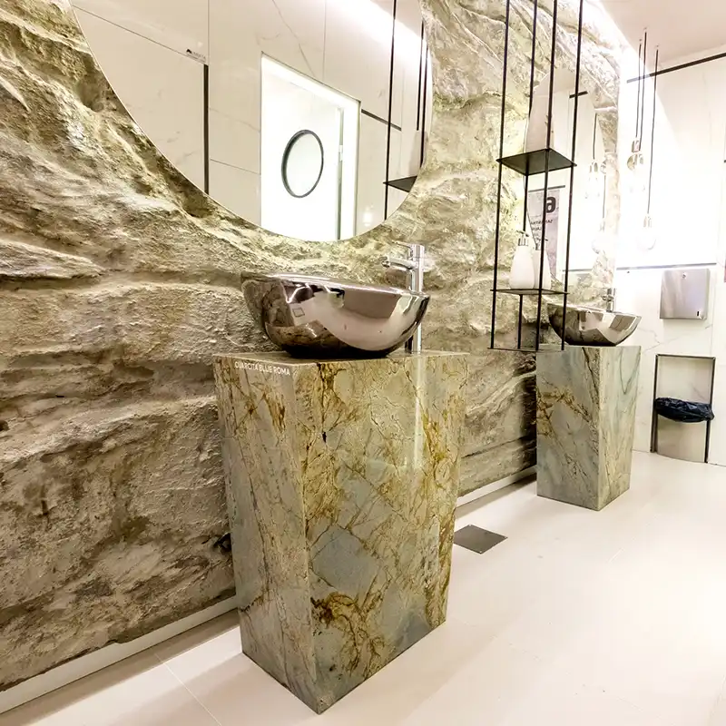 Material de estética elegante y ecléctica. Crea un nuevo lenguaje decorativo en el mabiente que se lo proyecte. Su apariencia de piel pétrea luminosa y con marcadas vetas, recrean un movimiento suave, remitiendo a las olas del mar. Capaz de teñir los ambientes de una paleta cromática en tonos azules matizados con grises, ocres y tostados, siendo sin duda el notable foco de atención.